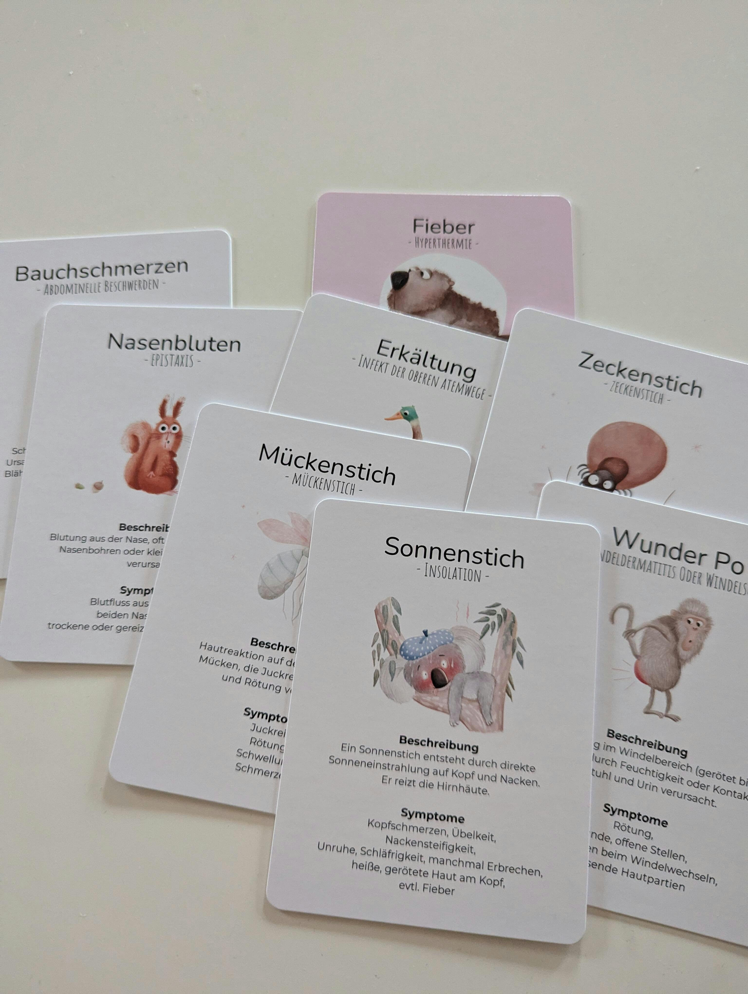 1. Schnelle Hilfe: Das Wichtigste steht auf den Karten, kompakt beschrieben. Symptome, Behandlung, Medikamenten-Hinweise und erste Maßnahmen, um deinem Kind zu helfen.